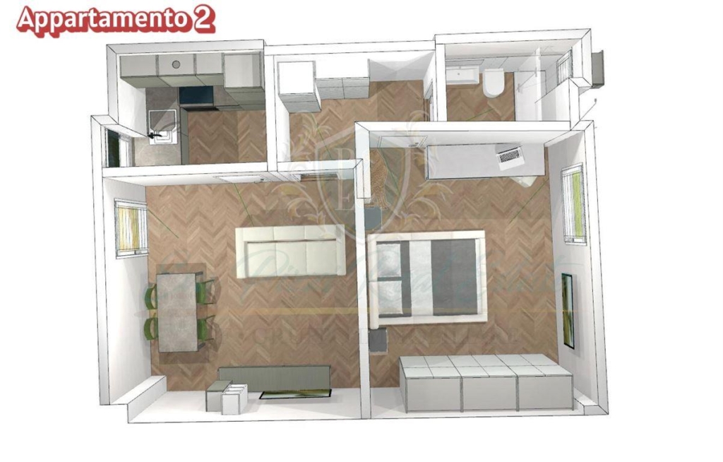 L’appartamento, di 52 mq, è oggetto di un’accurata riqualificazione; ed è così disposto: ingresso indipendente, soggiorno, cucina semi abitabile, camera matrimoniale, un bagno finestrato e zona lavanderia.